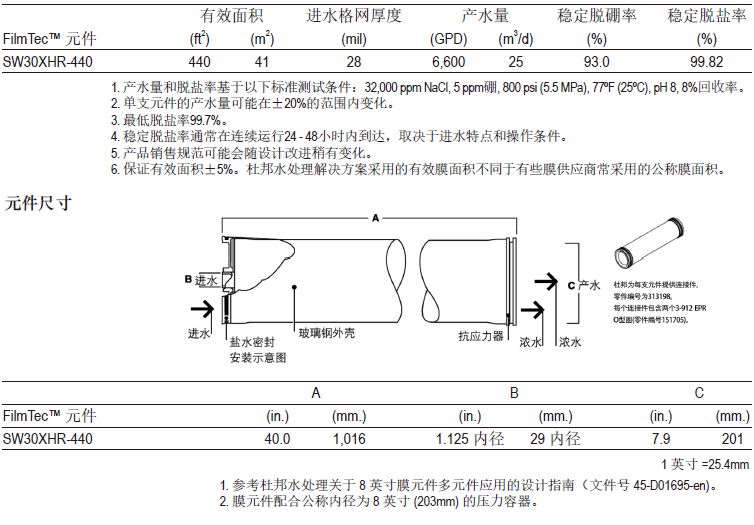 在杜邦FilmTecTM產(chǎn)品系列里,SW30XHR-440元件是脫鹽率最高的海水反滲透膜元件,多數(shù)情況下,采用一級(jí)海水反滲透系統(tǒng)就可達(dá)到嚴(yán)格的水質(zhì)要求。此外,最高有效膜面積和較寬進(jìn)水格網(wǎng)的組合,能夠提高生產(chǎn)率,降低清洗頻率,從而實(shí)現(xiàn)可持續(xù)的較低的運(yùn)行周期成本。FilmTecTMSW30XHR-440元件有以下優(yōu)點(diǎn):
