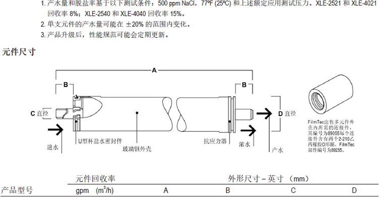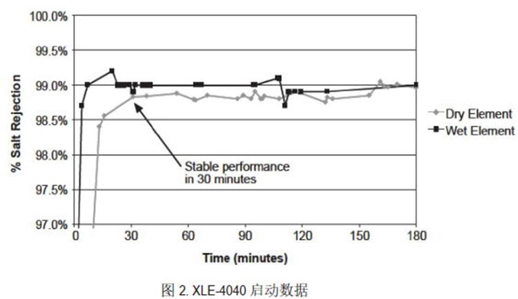 新一代 杜邦FilmTecTM XLE元件以其極低的運行壓力為客戶提供最好的系統綜合性能及運行經濟性。XLE膜元件采用了新型專利技術,提供始終如一的可靠系統性能。更方便的是,FilmTecTM XLE元件在干膜狀態下可實現快速啟動(見圖2)。新XLE系列元件替代了采用舊膜技術制造的TW30LE元件。