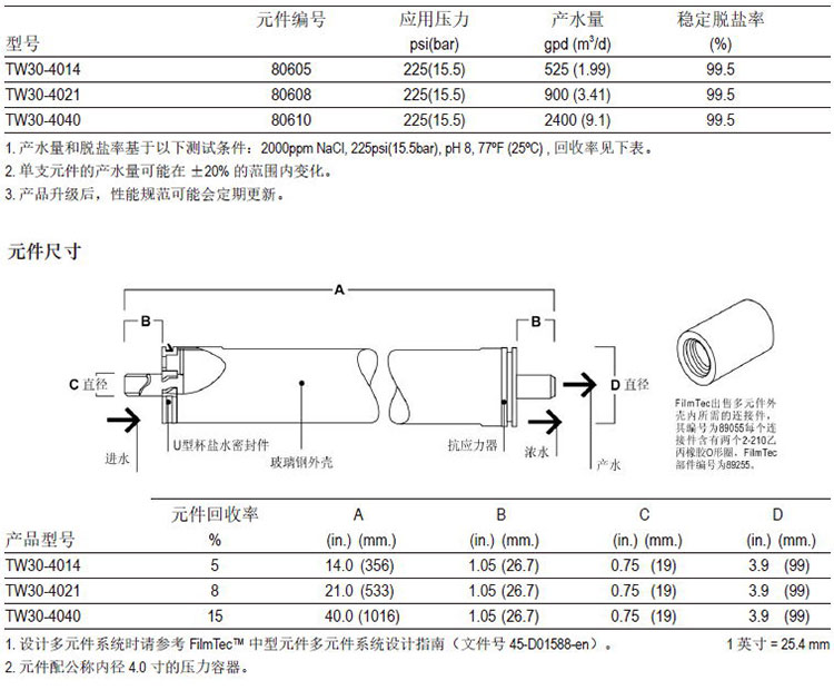 ● FilmTecTMTW30-4014和TW30-4021是專門設計適用于產水量小于0.2m3h (1gpm)但又要求高品質產水的小型商業系統