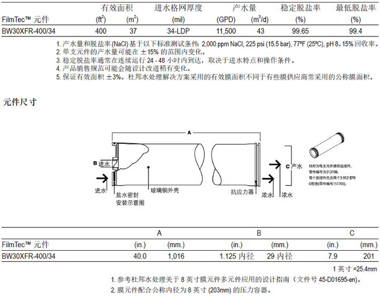杜邦FilmTecTM BW30XFR-400/34元件經證明,具有優異的性能: