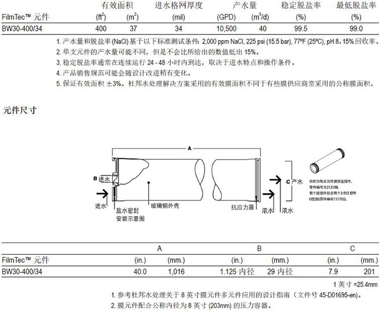 杜邦FilmTecTM BW30-400/34元件經(jīng)證明,具有優(yōu)異的性能: