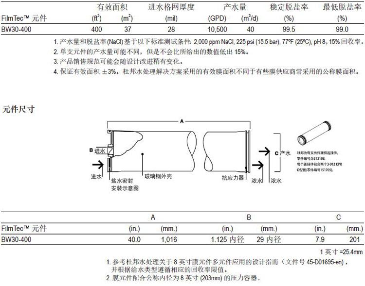 杜邦FilmTecTM BW30-400在要求高品質的產水時是很好的產品選擇。這是市場上第一款400平方英尺的膜元件,繼續被廣泛用于新設備和舊系統改造,尤其系統資金和生產力是考慮因素時。