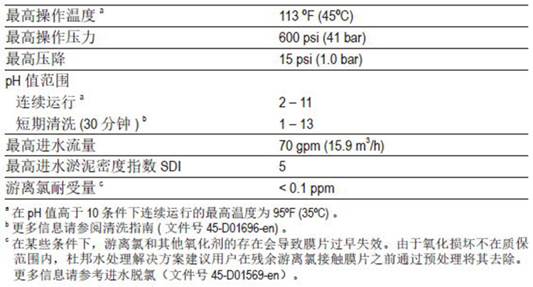 ● FilmTecTM BW30-400膜元件在生產過程中無預氯化處理,保證了高產水量和高脫鹽率。這是為什么FilmTecTM元件相比其他品牌元件更耐用且可以在最寬的pH耐受范圍(1-13)進行化學清洗的原因