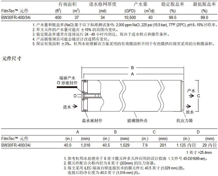 杜邦FilmTecTM BW30FR-400/34i是一款適用于處理高污染水源、同時具有抗污染性、高脫鹽率和高產水量的抗污染膜元件。