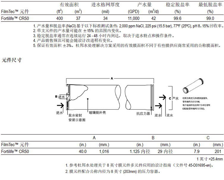 ● FilmTecTMFortilifeTMCR50反滲透膜元件設(shè)計(jì)在處理有生物污染和有機(jī)物污染傾向的水源時(shí)可提供更長的膜元件壽命和可靠的系統(tǒng)性能。