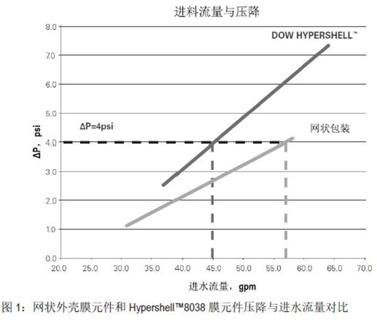 FilmTecTM HypershellTM元件的外部旁路較少,在同等壓降下需要的進水流量比網狀外殼膜元件低30%左右。下圖為4psi壓降下兩種膜元件的流量對比圖。通過減少流量可降低能耗。