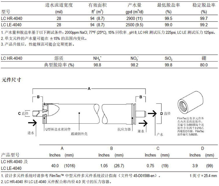 杜邦FilmTecTM LC4040產(chǎn)品范圍可滿(mǎn)足商業(yè)應(yīng)用中的多種客戶(hù)需求,從生產(chǎn)高純度水到實(shí)現(xiàn)低總體系統(tǒng)成本。杜邦的膜元件均為全自動(dòng)生產(chǎn),為行業(yè)中最具一致性的產(chǎn)品,將水處理系統(tǒng)的總體所有成本降至最低。 ● LCHR-4040高脫鹽率四英寸膜元件,采用杜邦最先進(jìn)的高脫鹽率反滲透膜材料,產(chǎn)水水質(zhì)更好 ● LCLE-4040低能耗四英寸膜元件,采用杜邦為低能耗應(yīng)用開(kāi)發(fā)的創(chuàng)新專(zhuān)有技術(shù),能夠在給水水質(zhì)差、運(yùn)行壓力低條件下工作
