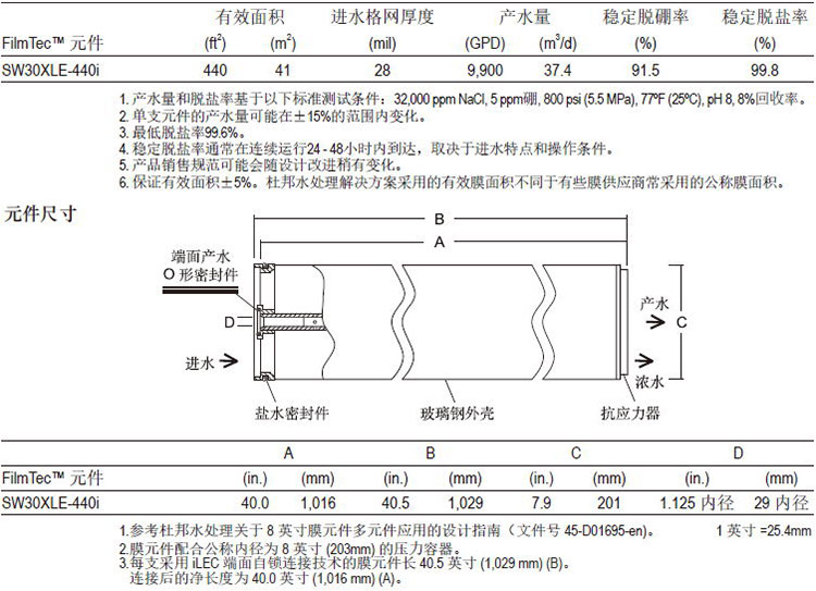 杜邦FilmTecTM SW30XLE-440i元件采用超低能耗和單級設計,實現了高生產效率和高脫鹽率的完美結合,非常適用于中等鹽度及中等溫度進水條件。當設計兩級海水淡化或高TDS苦咸水系統時,該產品也是最理想的選擇。高有效膜面積和寬進水格網的組合,不僅能大幅提高生產效率,而且還可顯著減少清洗頻率,從而實現可持續的較低運行周期成本。FilmTecTM SW30XLE-440i元件有以下優點: