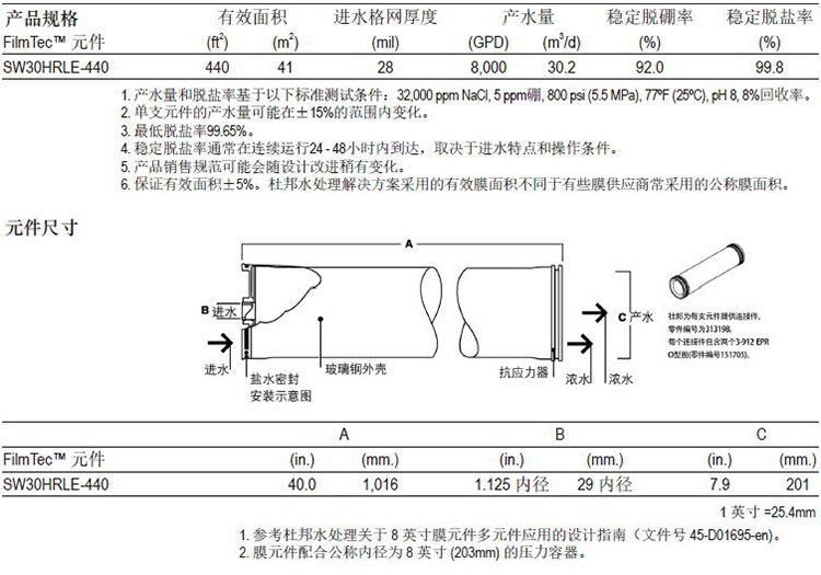 杜邦FilmTecTM SW30HRLE-440元件有著高脫鹽率和低能耗的組合特點,同時還有著最高有效膜面積和寬進水流道,能夠為中等和高等鹽度進水的系統提供可持續的低生命周期成本。FilmTecTM SW30HRLE-440元件有以下優點: